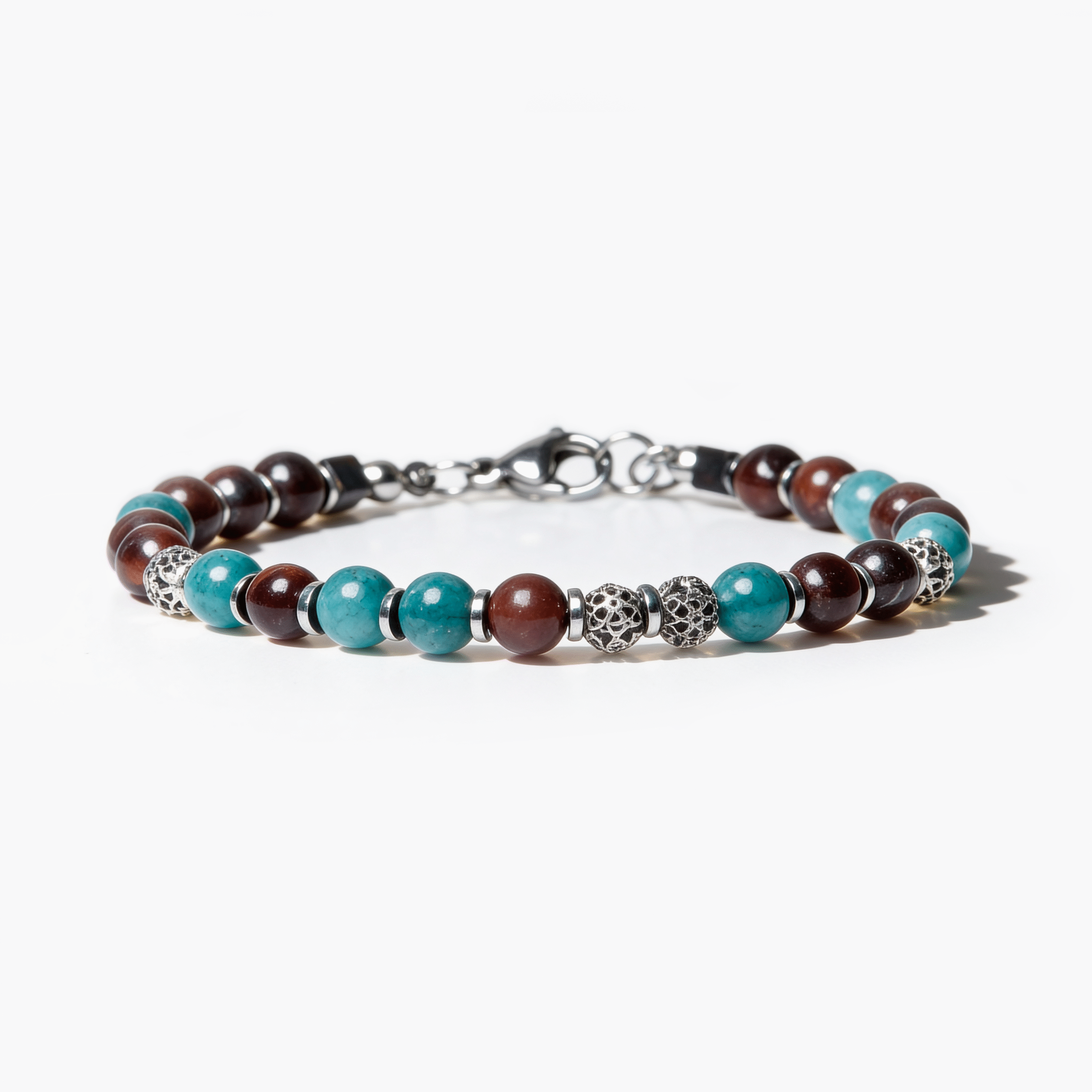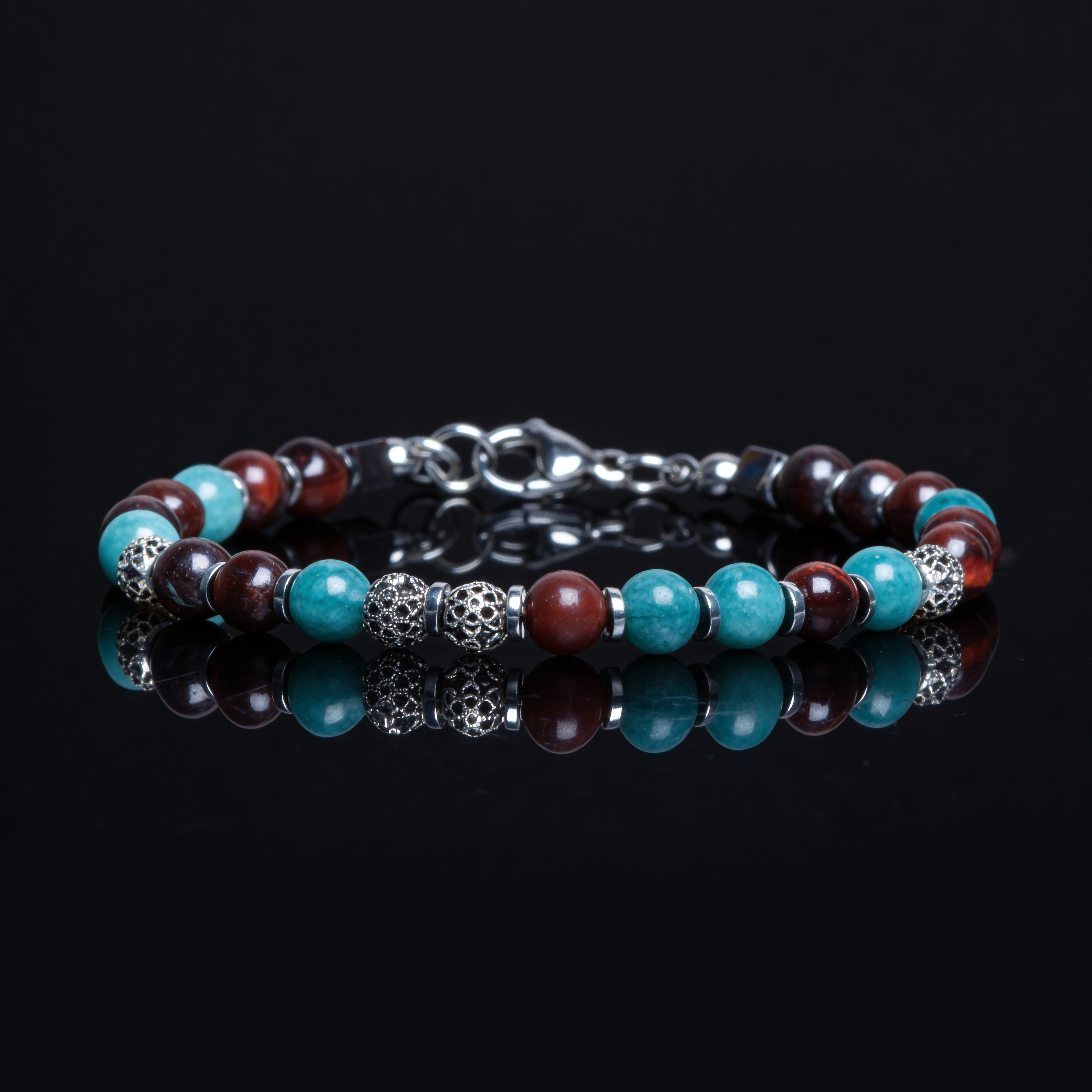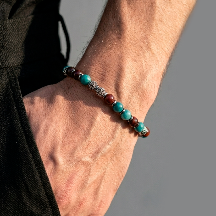 Brazalete en piedras naturales: Ojo de buey, Crisocola, Hematita, y Herrajes en acero quirúrgico.